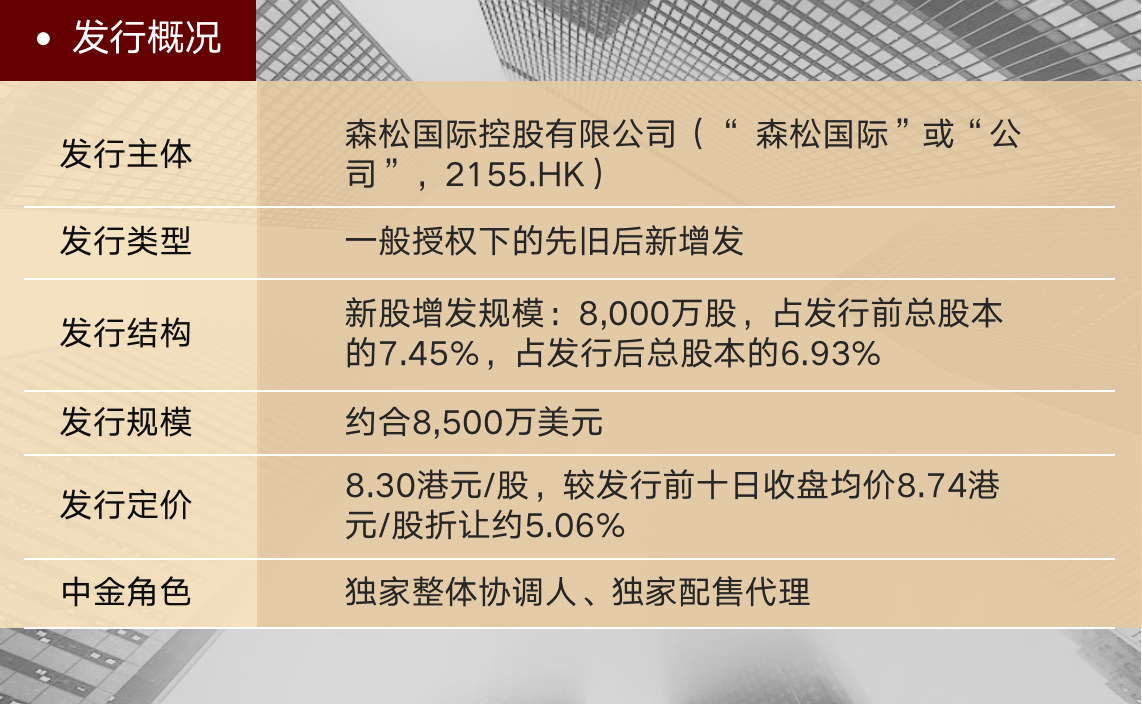1月12日,森松国际控股有限公司(“森松国际”或“公司”,2155.HK)完成一般授权下的先旧后新增发项目。本次新股增发规模为8,000万股,占发行前总股本的7.45%,占发行后总股本的6.93%,发行价为8.30港元/股,发行规模约合8,500万美元。中金公司担任独家整体协调人及独家配售代理。