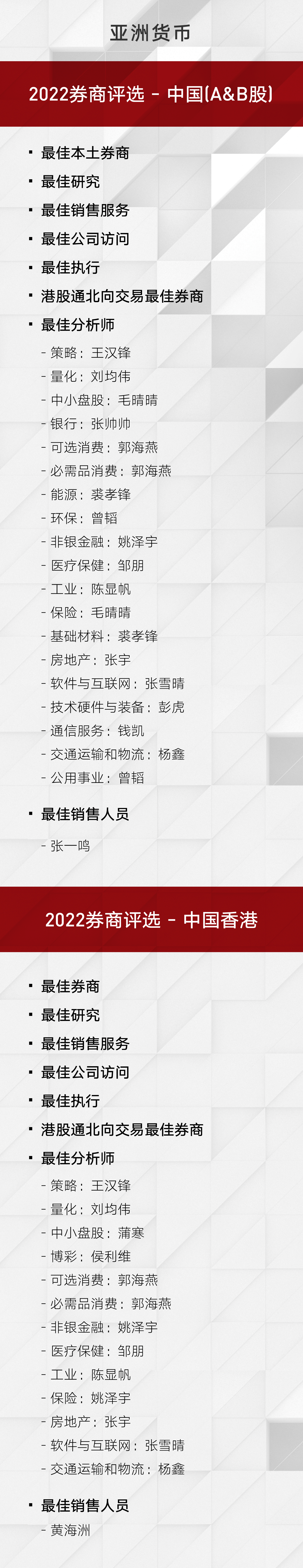 同时,中金分析师和销售人员在本届评选的个人类奖项评比中,在中国区(A&B股/中国香港)全部47项个人单项奖中获得34项第一。中金本届评选全部所获奖项一览如下: