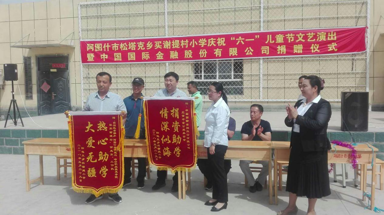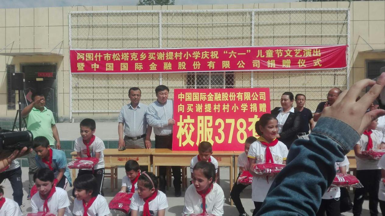 为了改善贫困地区教育条件,贯彻“扶贫扶智”的公益理念,2018年六一儿童节前夕,中金公益基金会向新疆克州阿图什市松他克乡买谢提村小学捐赠了378套校服,并将于9月1日新学期开学之前落实食堂改造、操场重建和课桌椅捐赠项目,捐款捐物约合28万元。